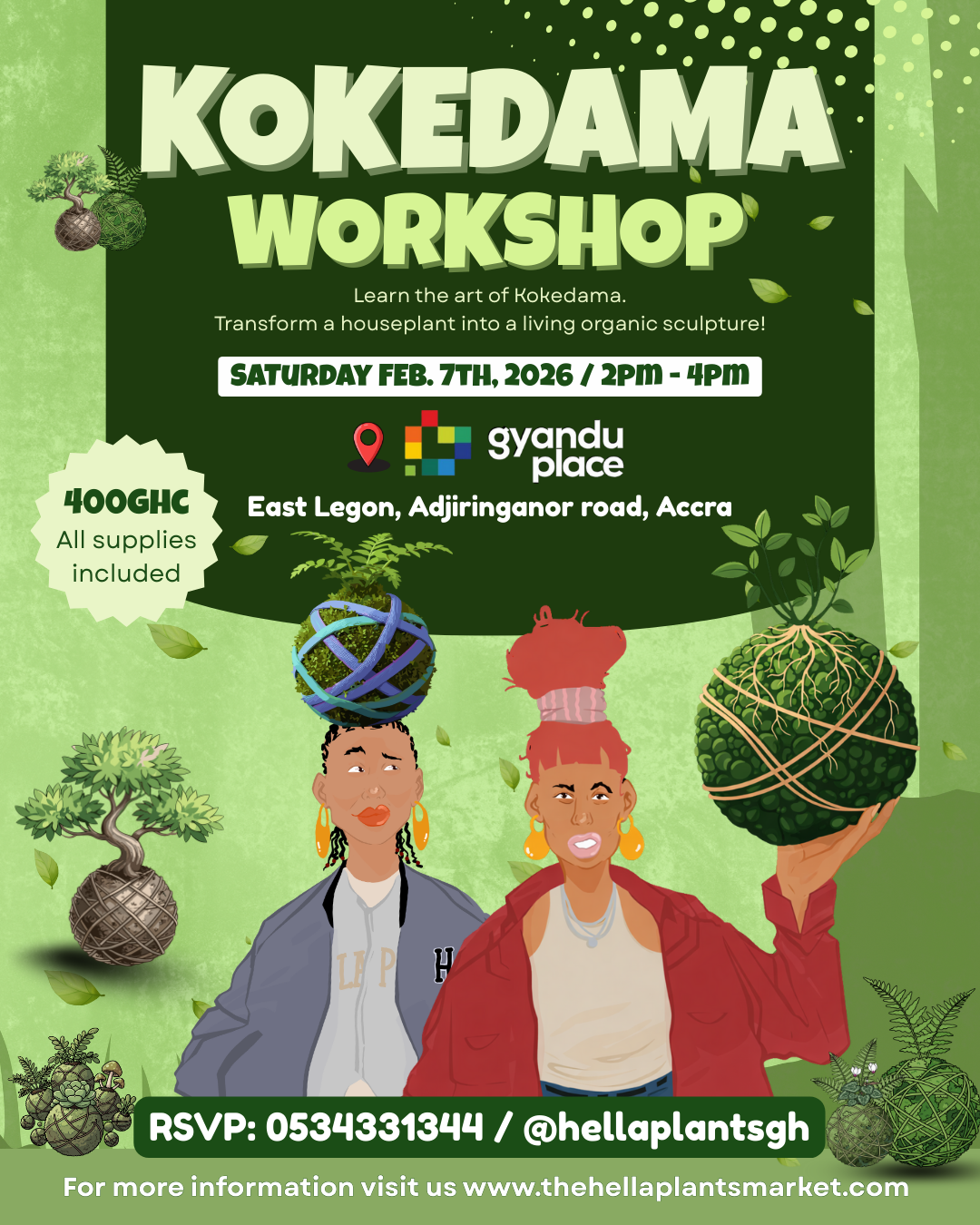 Janay Masters, co-founder of Hella Plants Accra, will be leading the Kokedama workshop alongside her friends. Janay will guide you through every step of creating your own Kokedama, sharing tips and techniques to make sure your plant thrives. She is excited not only to teach the workshop but also to meet new friends, connect with fellow plant lovers, and share the joy of bringing greenery into your space.